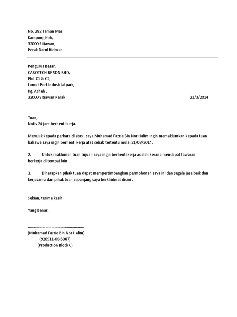 Contoh Surat Berhenti Kerja 24 Jam Bahasa Melayu Doylc Asia